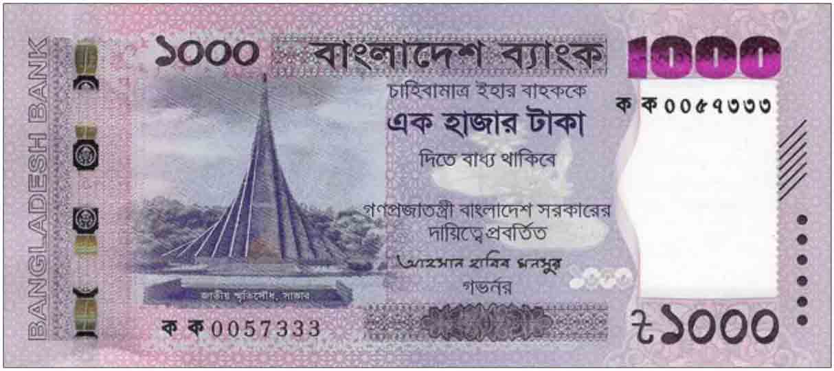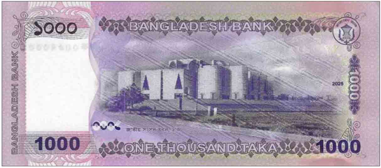 Violet, purple, tan, and green banknote. Front: Bengali and English text, National Martyrs’ Monument in Savar, shapla flowers, denomination, OVI feature. Back: Bengali and English text, Jatiya Sangsad Bhaban (National Parliament building) in Dhaka, bank logo. Windowed security thread. Watermark: Royal Bengal tiger on pixelated background with electrotype bank logo and “1000.” Paper, 160 × 70 mm, printed by Security Printing Corporation.