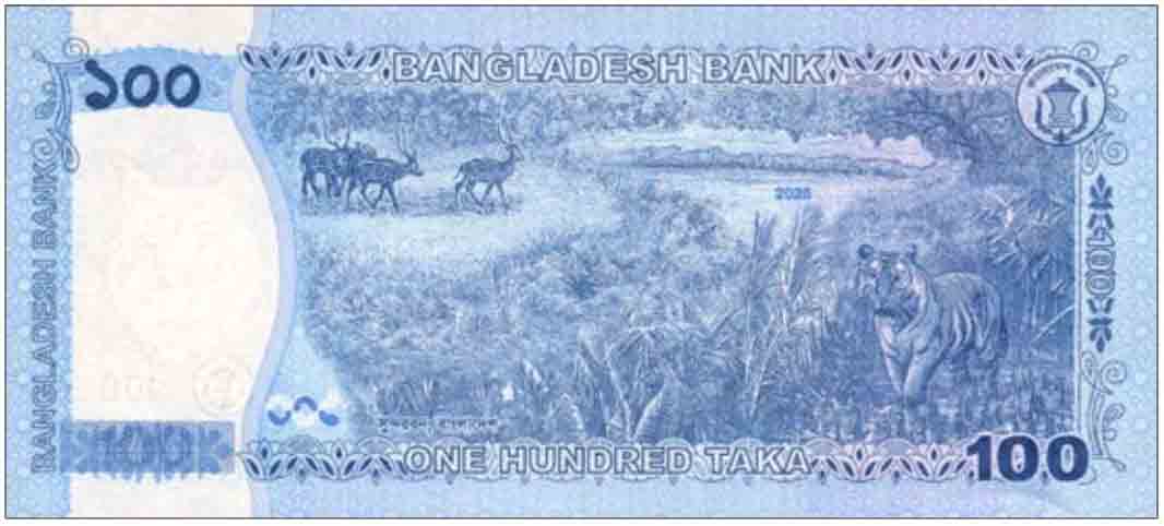 Blue and pink banknote. Front: Bengali and English text, Shaat Gombuj Masjid (Sixty Dome Mosque) in Bagerhat, shapla flowers, denomination, OVI feature. Back: Bengali and English text, group of spotted deer and Bengal tiger in Sundarbans Mangrove Forest, bank logo. Security thread unknown. Watermark: Royal Bengal tiger on pixelated background with electrotype bank logo and “100.” Paper, 140 × 62 mm, printed by Security Printing Corporation.