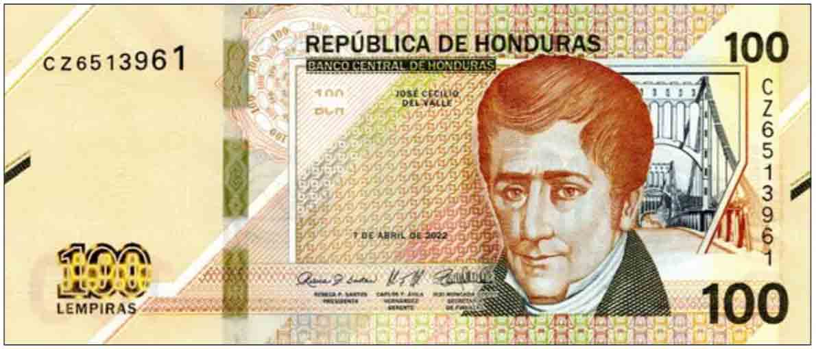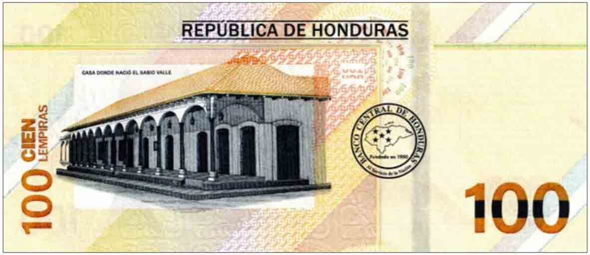 Brown, green, and yellow. Front: Spanish text; denomination in gold-to-green SPARK; 100 BCH as registration device; Jose Cecilio Diaz del Valle; Rio Choluteca suspension bridge in Choluteca. Back: Spanish text; house with colonnade in Choluteca where Jose Cecilio Diaz del Valle was born (casa donde nacio del sabio Valle); 100 BCH as registration device; seal of Banco Central de Honduras. Green windowed security thread with demetalized BCH. Watermark: Jose Cecilio Diaz del Valle and electrotype BCH. Printer: (Crane Currency). 156 x 67 mm. Paper.
