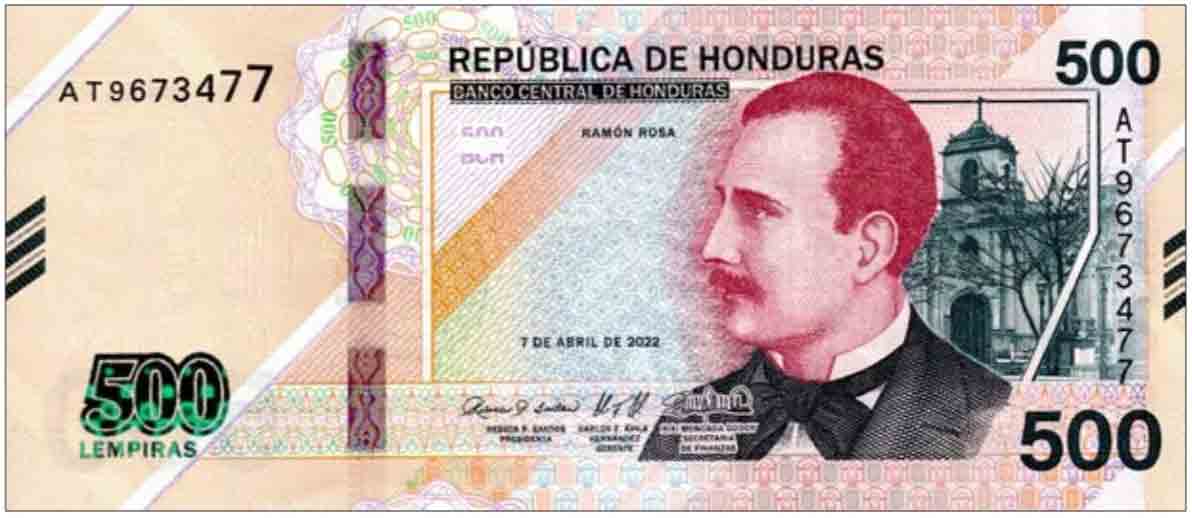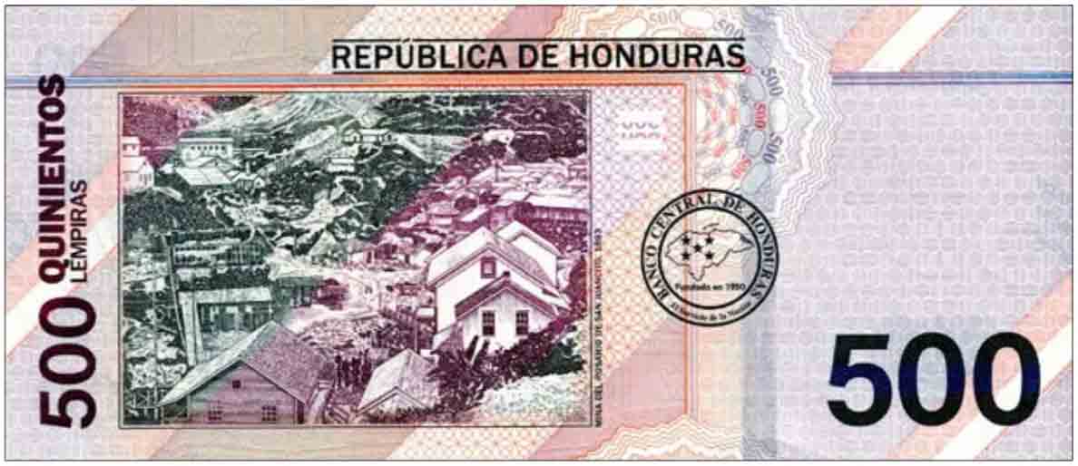 Purple, red, orange, and green. Front: Spanish text; denomination in green-to-blue SPARK; 500 BCH as registration device; Ramon Rosa; La Merced church. Back: Spanish text; mining buildings at Rosary of San Juancito (mina del Rosario de San Juancito, 1893); 500 BCH as registration device; seal of Banco Central de Honduras. Violet windowed security thread with demetalized BCH. Watermark: Ramon Rosa and electrotype BCH. Printer: (Crane Currency). 156 x 67 mm. Paper.