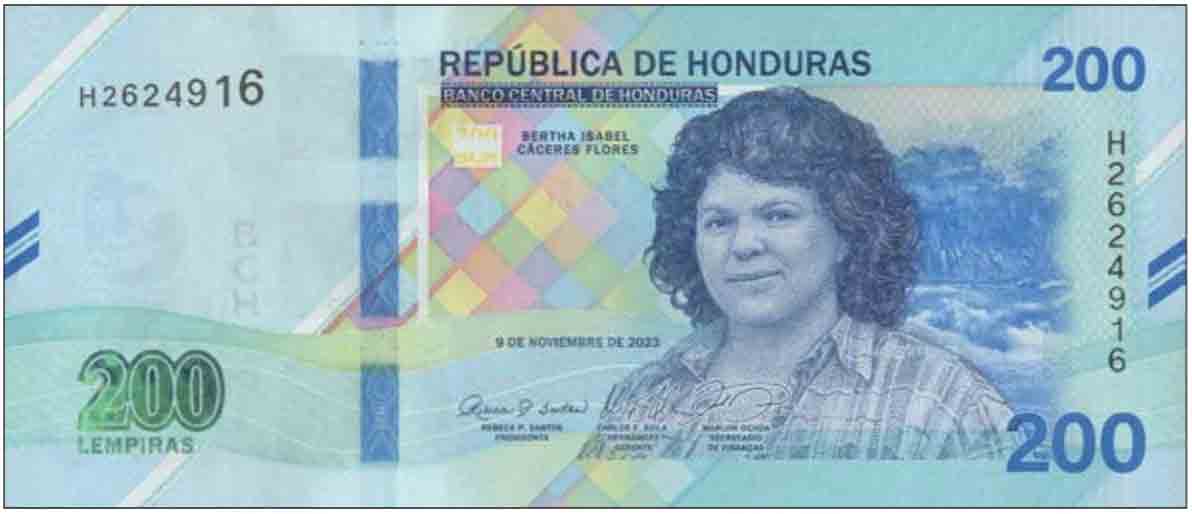 The Honduran Lempira 200 Lempira commemorative banknote honors Berta Cáceres, recognizing her legacy in defending the environment and indigenous rights. Issued for International Women’s Day, it marks the first time a woman has been featured on a Honduran banknote.