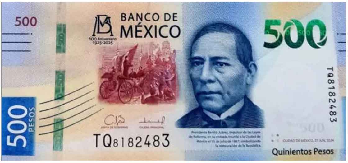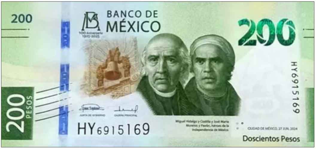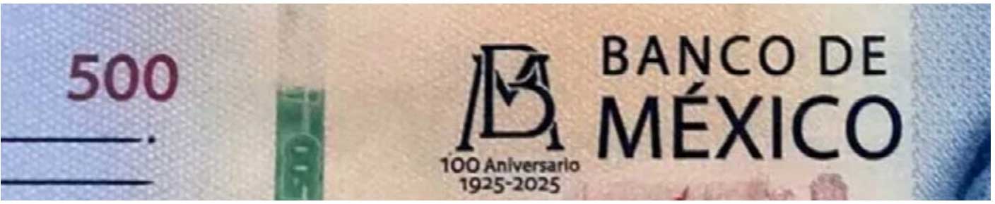 Commemorative Issue – 100th Anniversary of Banco de México. These notes celebrate the 100th anniversary of the Banco de México, featuring the inscription “100 Aniversario / 1925 – 2025” printed below the bank’s monogram on the front.
