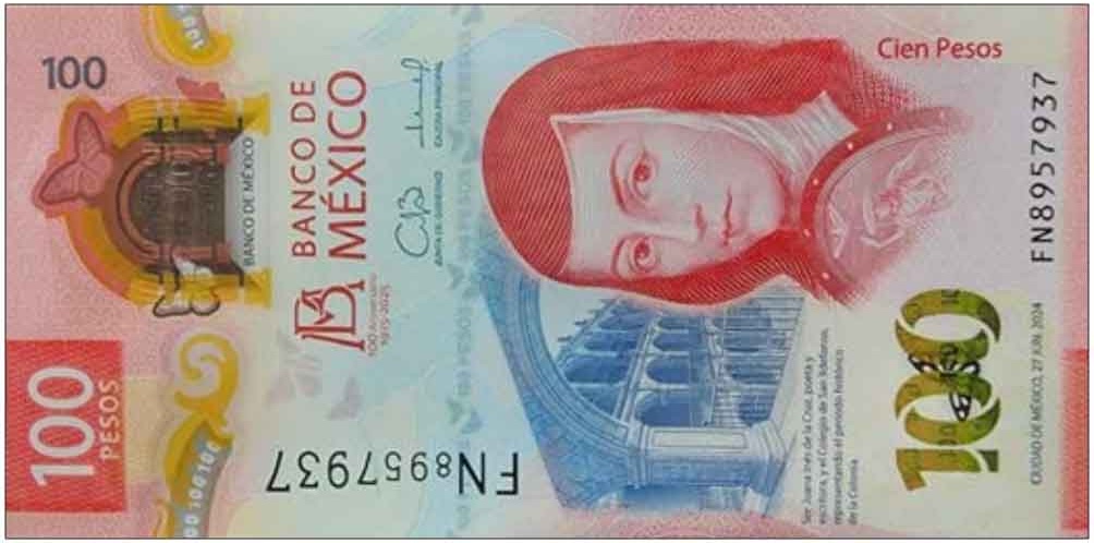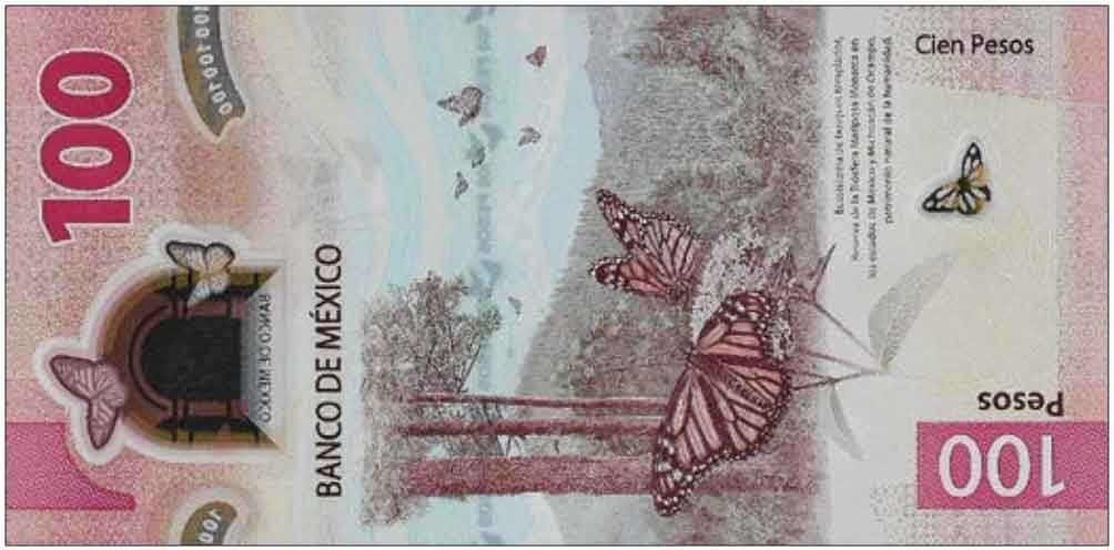 Red. Front (vertical): Spanish text; denomination in gold-to-green SPARK; main patio of Antiguo Colegio de San Ildefonso, Mexico City; Juana de Asbaje y Ramírez de Santillana (Sor Juana Inés de la Cruz). Back (vertical): Spanish text; temperate forest ecosystem of pine, oak, and oyamel trees in Monarch Butterfly Biosphere Reserve, Michoacán de Ocampo. Simulated security thread with printed 100 PESOS and butterflies. Watermark: None. Printer: BANCO DE MEXICO. 132 x 65 mm. Polymer (Guardian).
