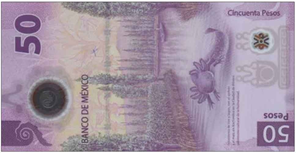 Red. Front (vertical): Spanish text; denomination in gold-to-green SPARK; main patio of Antiguo Colegio de San IPurple. Front (vertical): Spanish text; denomination in gold-to-green SPARK; city of Tenochtitlan, from Diego Rivera’s mural, -La Gran Tenochtitlan:” eagle perched on a cactus with ‘Ad tlachinolli” in its beak, from fragment of monolith known as “Teocalli de la Guerra Sagrada” (pyramid surmounted by the temple of the sacred war). Back (vertical): Spanish text; ecosystem of rivers and lakes; Mexican salamander (ajolote); corn field within the landscape of Xochimilco, Mexico City. Simulated security thread with printed 50 PESOS. Watermark: None. Printer: (Banco de Mexico). 125 x 65 mm. Polymer (Guardian).