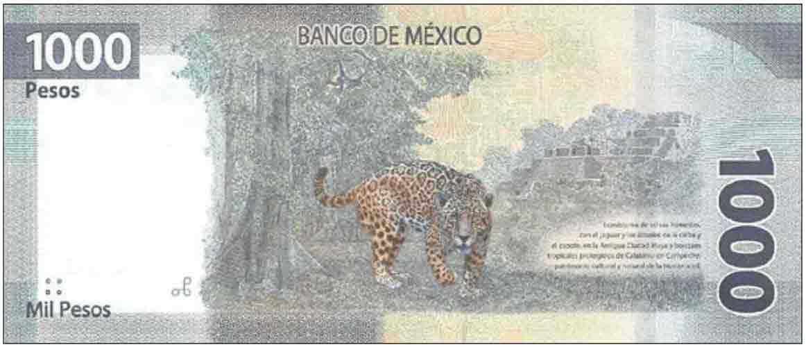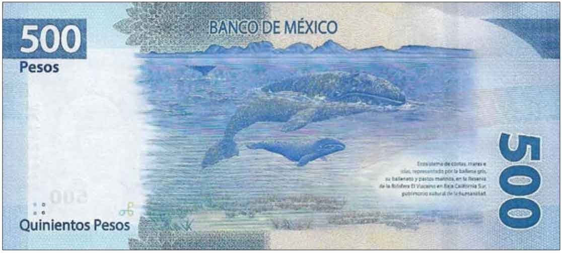 The 500-peso note is the first denomination in a new family of banknotes with improved security features and designs representing Mexico’s historical and natural heritage. The 20-peso note will be replaced by a coin, and the bank is adding a 2,000-peso note. The backs depict elements of fauna and flora identified with each of Mexico’s ecosystems, including rivers and lakes, temperate forests, dry forests, thickets and deserts, coasts, seas and islands, and rainforests, through recognized sites in the World Heritage list of the United Nations Organization for Education, Science and Culture (UNESCO).