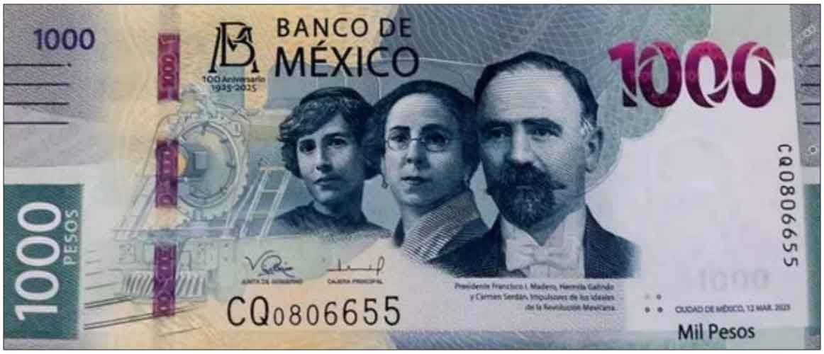 Gray. Front: Spanish text; bank monogram; railroad steam engine; Carmen Serdán, Hermila Galindo, and President Francisco I. Madero; denomination in purple SPARK Live. Back: Spanish text; rainforest ecosystem with jaguar prowling among ceiba and zapote trees; Ancient Mayan City of Calakmul, Campeche. Purple windowed Motion Rapid security thread with demetalized 1000 and solid security thread with demetalized 1000. Watermark: Francisco I. Madero and electrotype 1000. Printer: Banco de México. 153 x 75 mm. Paper.